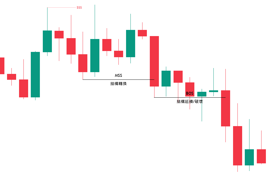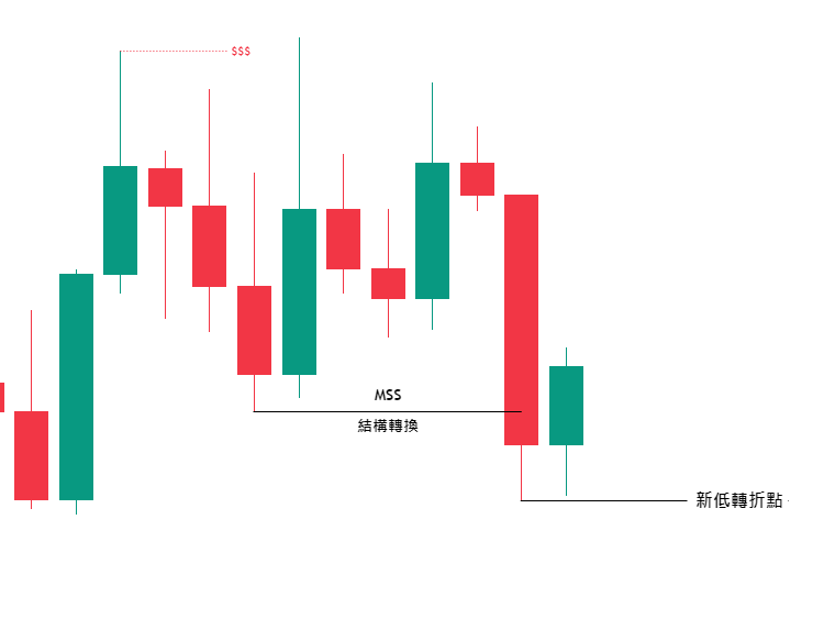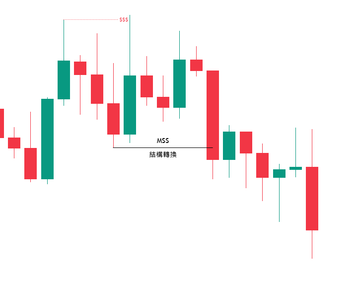 前面所講的就是結構轉換的原理,我們可以簡單的統整一下他的定義,當今天的價格進行了掃除前高或是前低,我們就可以以當前創造出的新高或是新低往左邊(前面過去的價格)找尋最近的反向的倉位,也就是反向的轉折點做價格反轉的確認(MSS - Market Structure Shift)