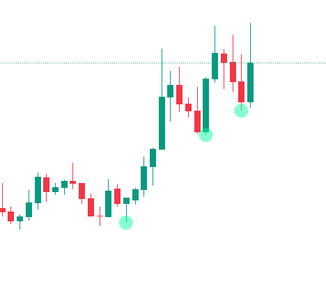 上圖可以看到標記螢光筆的低點,這幾個低點都可以發現有一個共通點,也就是都是市場的向上攻擊前的轉折點,代表著向上攻擊者的倉位,這幾個低點的形成意味著價格向下下跌時,有大量資金在這邊進場做多/買入,進而將市場繼續推高