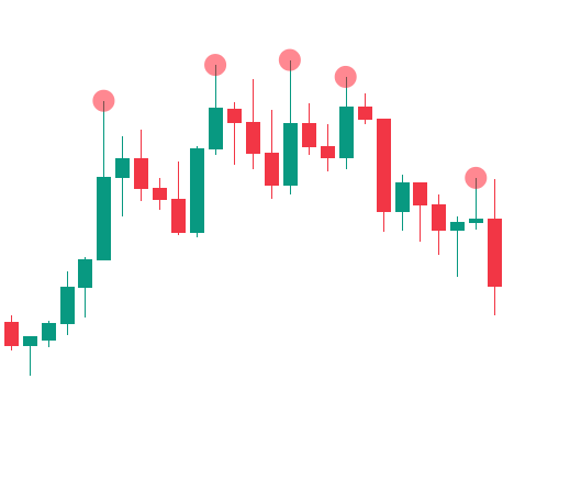 上圖中可以看到標記螢光筆的高點,這幾個高點都可以發現有一個共通點,也就是都是市場的向下攻擊的轉折點,也代表著向下攻擊者的倉位,這幾個高點的形成意味著價格向上上漲時,有大量資金在這邊進場做空/賣出,進而將市場繼續推低